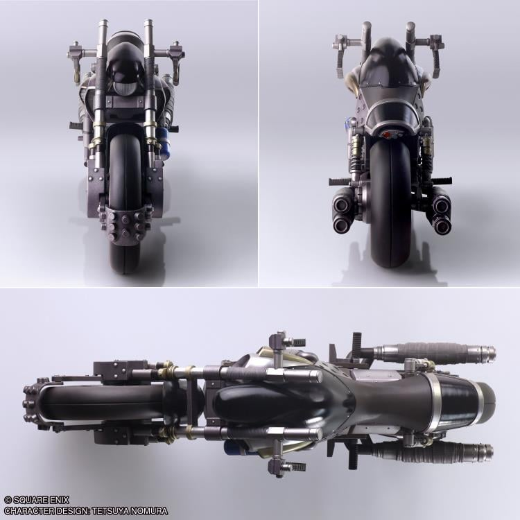 The sculpting is based on the designs from the original FINAL FANTASY VII with a heavy body and tires, a black metallic frame, distinct handlebar and engine structure, and other features that make this figure impactful.